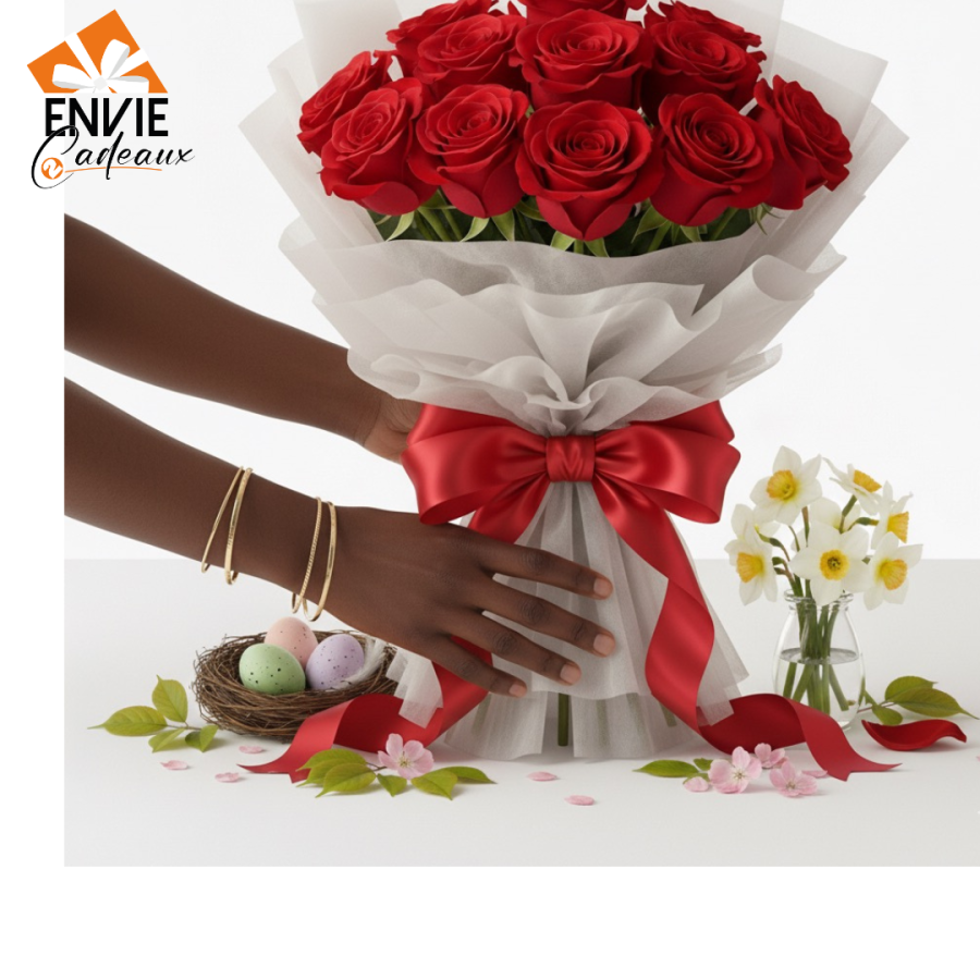 Ce magnifique bouquet est composé de 12 tiges de roses rouges bien emballés dans emballage papier fleurs .