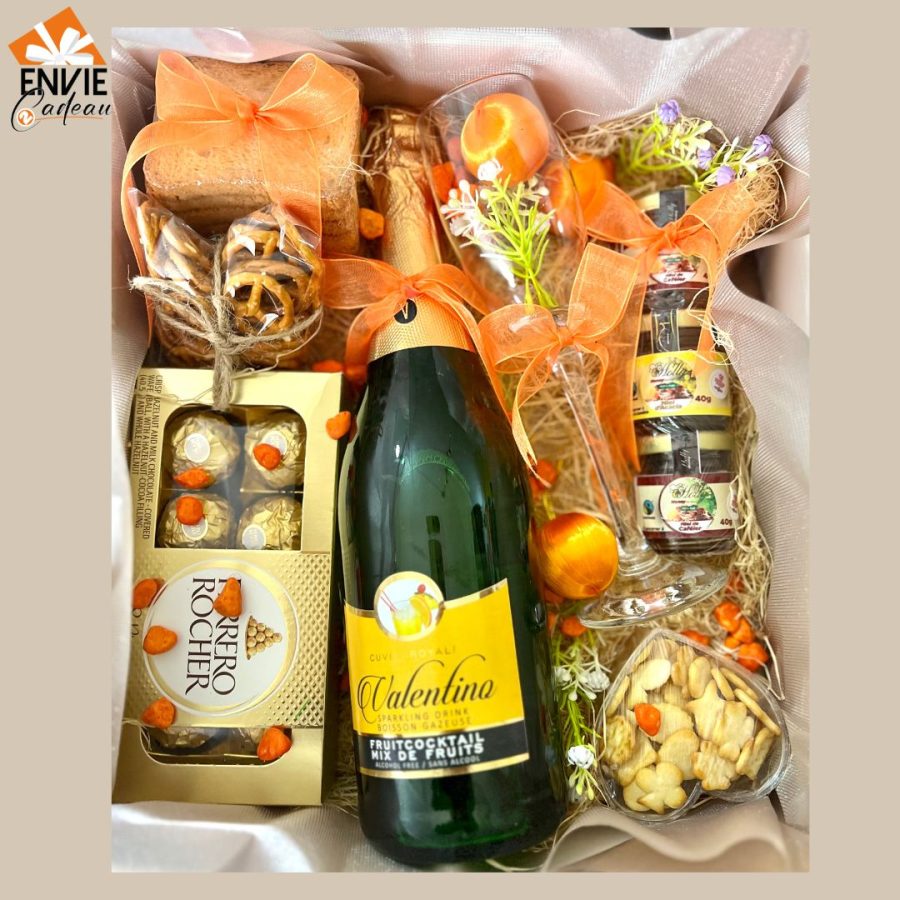 Box Cadeau Valentino, est très magnifique avec ces couleurs en orange, un passe partout et un contenant à se gaver, à offrir à des personnes qui ne consomment pas l’alcool.