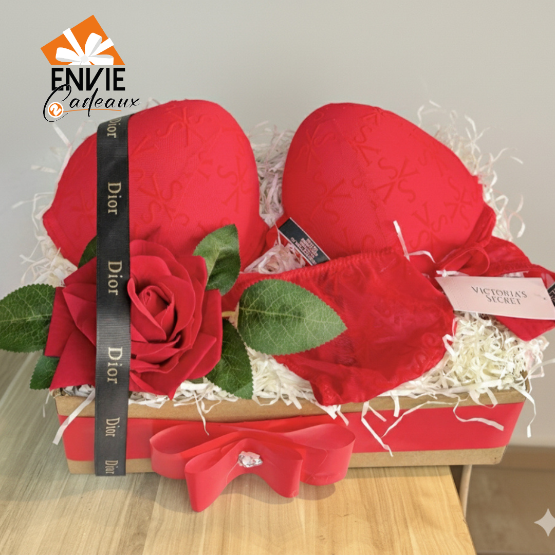 Lingerie complète de victoria secret dans un coffret glamour avec une rose artificielle