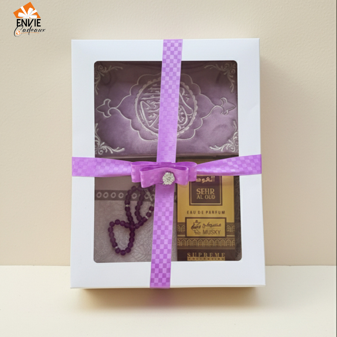 - Un tapis de prière doux de couleur violet, Le tapis est personnalisable