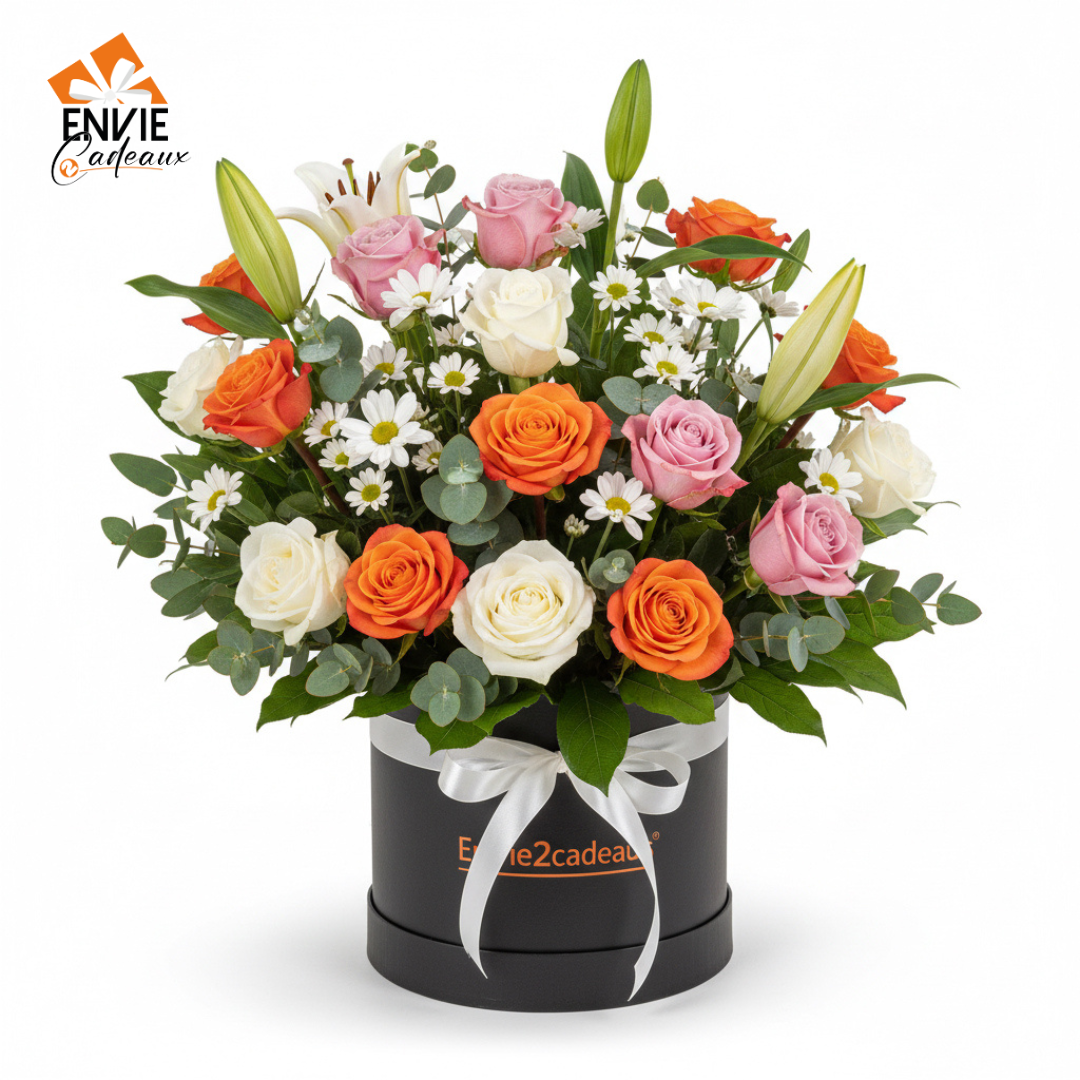 Mélanges de 23 roses de différentes couleurs orange, rose et blanc avec des marguerites, eucalyptus et lys le tout dans un grand coffret.