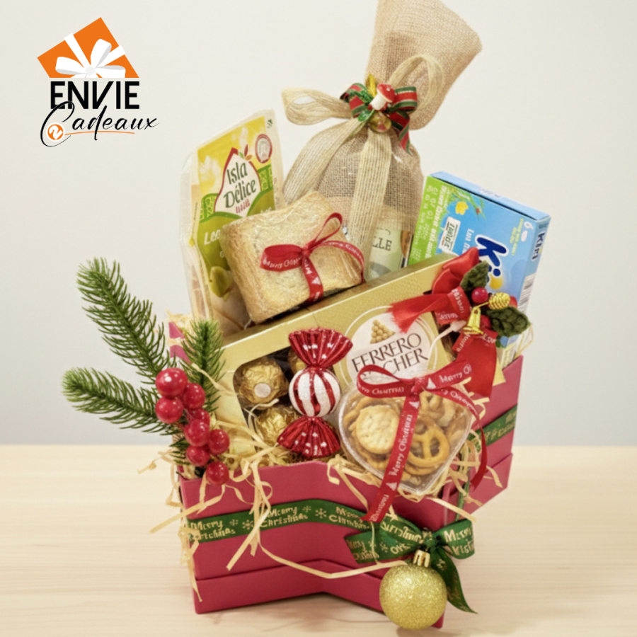 Plongez dans la magie de Noël avec le cadeau gourmand « l’etoile festive de nouvel an » est un coffret très beau avec une belle décoration de Noël et des éléments apéritifs à offrir à une personne spéciale pour partir ces bons moments de fêtes .